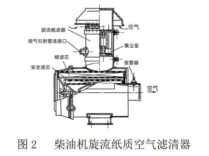 增壓柴油機用的旋流紙質濾芯,它主要由旋流粗濾器(內部豎置有旋流管)、紙質主精濾芯和安全濾芯三部分組成,如圖2所示。空氣經旋流管離心力的作用,使空氣中的絕大部分塵粒落入旋流管下端的集塵室,塵粒再經排氣引射管隨柴油機廢氣一起排出。粗濾后較清潔的空氣通過紙質精濾及安全濾芯濾清,最后進入發動機氣缸。