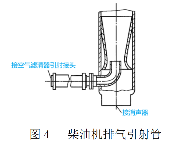 此外,需要注意的是當采用上述旋流紙質空氣濾清器時,消聲器出口處需預裝有與之匹配的排氣引射管(安裝在消聲器出口處,如圖4所示)。當柴油機排氣時,高速氣流通過喉管處使廢氣氣流增大,于是便形成了真空度。利用此真空度將空氣濾清器集塵室中的塵粒經橡膠管吸入排氣引射管內,并與柴油機廢氣一起排出。