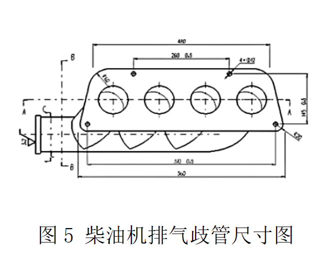 柴油機排氣管的作用是使廢氣從氣缸排出,結構尺寸如圖5所示。排氣管應具有較小的氣流阻力,以減小進氣和排氣阻力。現代柴油機還要求排氣管的結構形狀有利于氣流的慣性與壓力脈動效應,以提高充量和排氣能量的利用率。