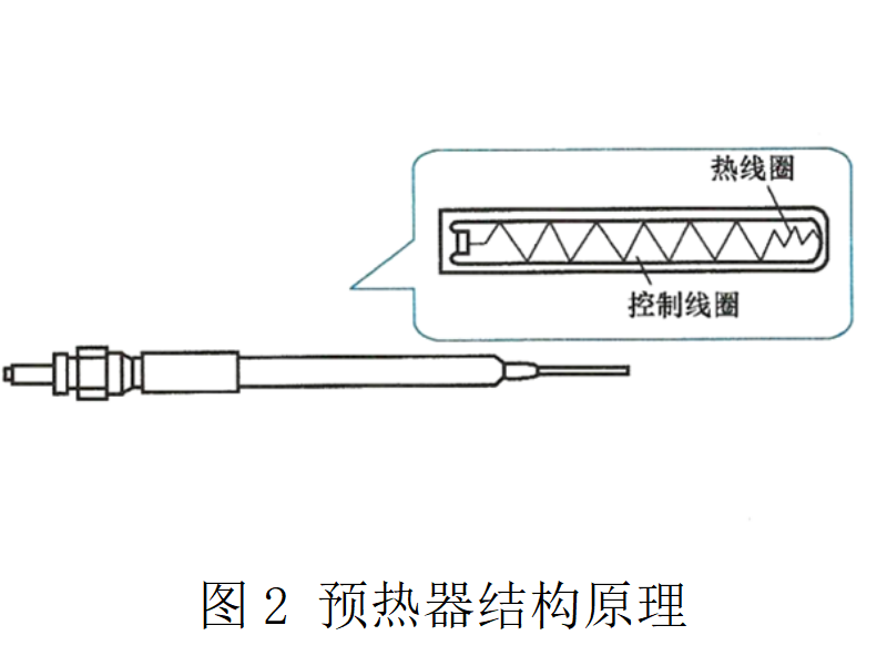 用于加熱燃燒室的空氣,如圖1所示;預熱器又稱為預熱塞,其結(jié)構(gòu)原理如圖2所示。預熱器內(nèi)裝有控制線圈,當其電阻隨著溫度的升高而增加時,可以減少流往與控制線圈串聯(lián)的熱線圈的電流量,使預熱器的溫度不會上升過高。預熱器的溫度可升至約900℃。