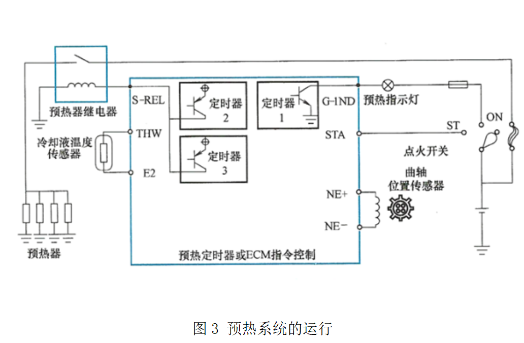 ② 當起動開關(guān)旋至ST時,預熱定時器或ECU指令控制將預熱器接通,防止預熱器溫度在起動時下降和改善起動性能。